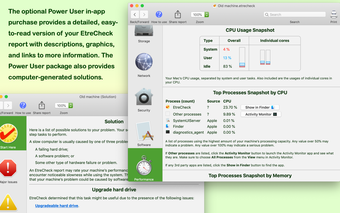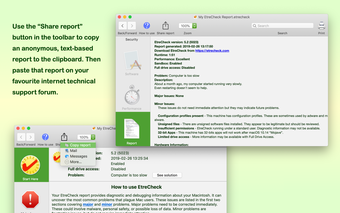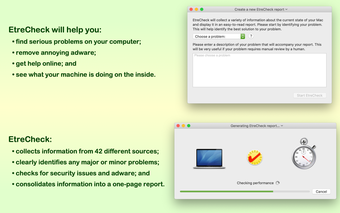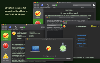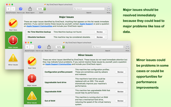 EtreCheck, temel temel özellikleriyle basittir . 50'den fazla belirli sorunu algılayabilir ve bunları büyük veya küçük sorunlar olarak tanımlar. Uygulama ayrıca, kontrol sırasında bulunan tüm sorunları içeren anonim ayrıntılı bir metin raporu oluşturur. EtreCheck, bir yedek kopyanın olmaması, sabit sürücünüzün arızalanması, bellek kapasitesi ve düşük disk alanı gibi sorunları tespit edebilir. Raporlar ayrıca, sorunların kaynağı olan sisteminizin parçalarını da içerir.